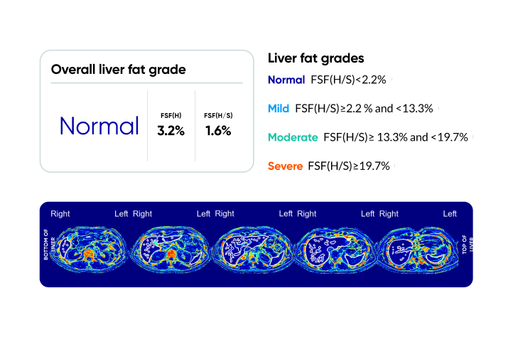 Liver fat percent and grade, visual heat map of liver fat distribution.