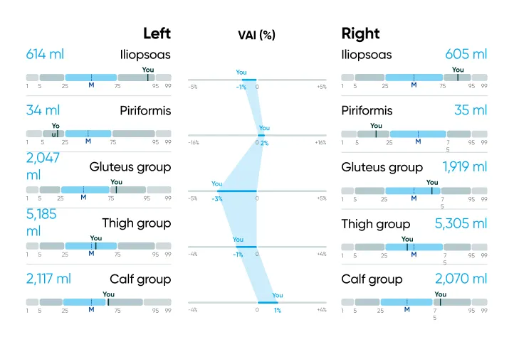 - Muscle volume, with detailed insights into lower body muscle volume and symmetry analysis