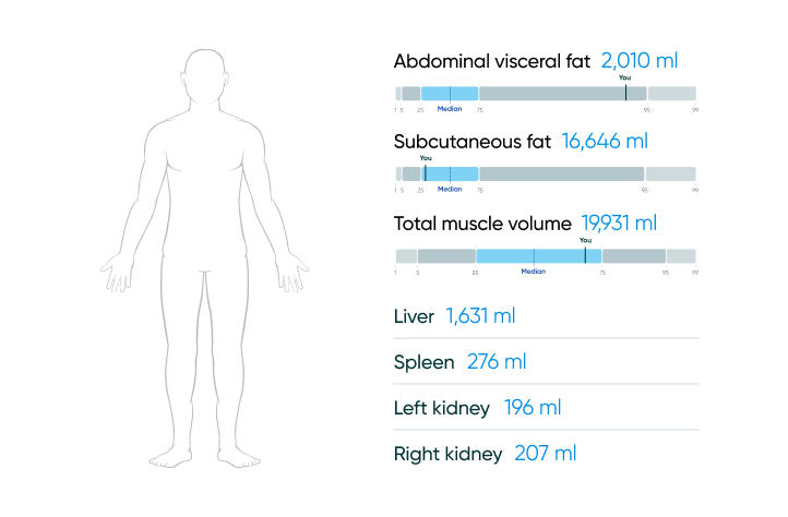 Our proprietary FDA-cleared medical software and AI-learning algorithm that provides a detailed analysis of your body’s muscle mass, symmetry, body fat, and organ volume to help track changes or health insights tied to excess visceral fat or muscle loss.